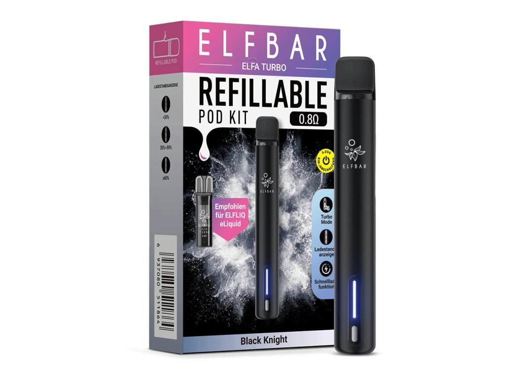 ELFA TURBO je výkonný a elegantní POD systém z oblíbené série Elf Bar ELFA. Vyniká rychlým nabíjením, dlouhou výdrží baterie a praktickým LED indikátorem stavu baterie. Elf Bar ELFA TURBO Black Knight se pyšní stylovým designem a má odolné kovové tělo (nerezová ocel). Kombinujte s PODy, které najdete v kategorii ELFA (kompatibilní se všemi druhy předplněných PODů a prázdných PODů).