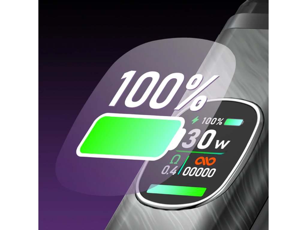 Stav baterie můžete sledovat na přehledném Ultra-HD displeji spolu s ostatními nastaveními (odpor, výkon...). Baterii nabijete pomocí USB-C kabelu, který je součástí balení.