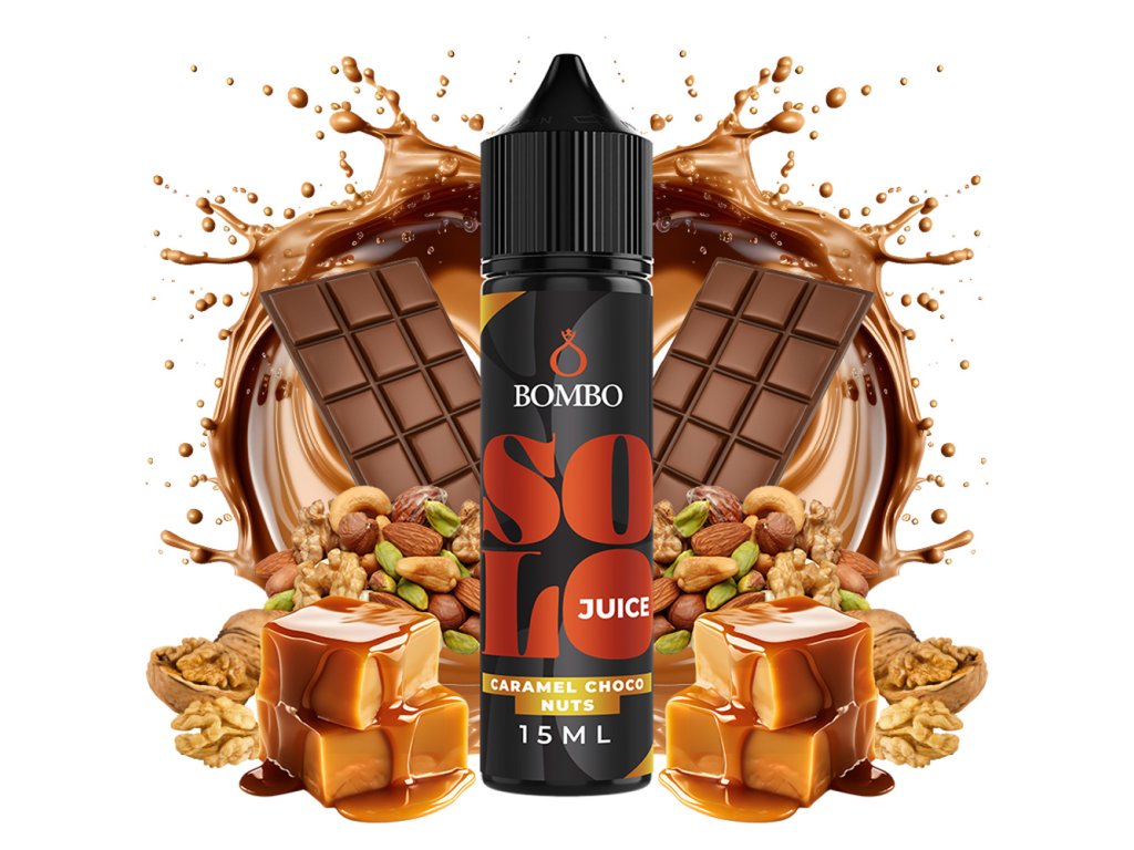 Bombo Solo Juice Caramel Choco Nuts je bohatá a sladká Shake & Vape příchuť ze série SOLO Juice, která spojuje jemný karamel, krémovou čokoládu a pražené ořechy. Výsledkem je dezertní aroma s plným tělem a lahodně hřejivým profilem. Příchuť pochází ze Španělska (ES), neobsahuje nikotin a je určena k míchání s bází a boosterem.