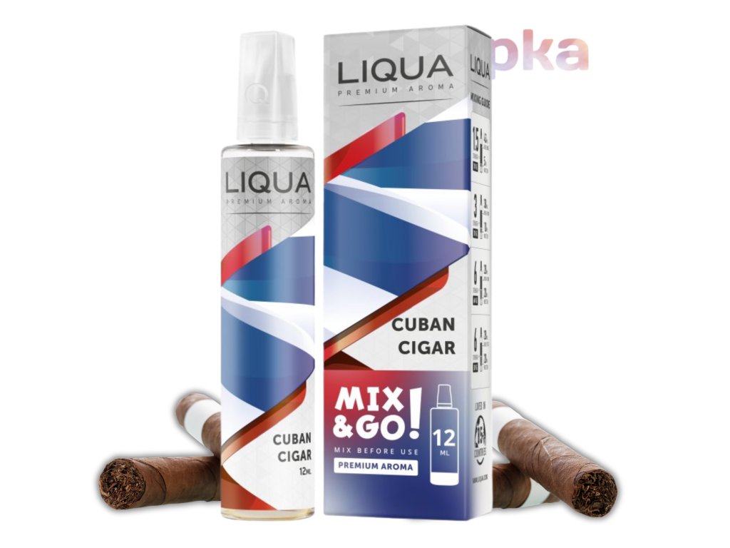 LIQUA Mix&Go Cuban Cigar je výrazná tabáková Shake & Vape příchuť inspirovaná pravým doutníkovým tabákem. Nabízí plnou, zemitou a bohatou chuť s typicky hlubokým charakterem, který ocení zejména zkušení vapery a milovníci hutných tabákových směsí. Profil působí autenticky, suše a velmi dospěle, bez zbytečné sladkosti. Aroma pochází z České republiky (CZ) a neobsahuje nikotin – je určeno k míchání s bází a boosterem.